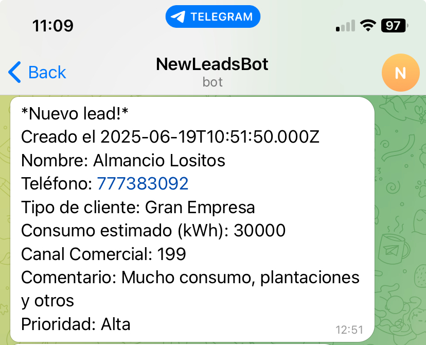 • Notification: Sends full lead info to assigned sales rep via Telegram